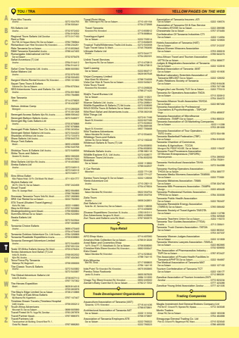 100 YELLOW PAGES ON THE WEBAssociation of Tanzania Insurers -ATI Dar es Salaam .......................................................... 0222 136574Association of Tanzania Oil & Gas Service Providers ATOGS Dar es Salaam........................... 0222 296586Chawamata Dar es Salaam ...................................... 0757 073483Confederation Of Tanzania Industries CTIDar es Salaam ...........................................................0222 114954 ......................................................................... 0222 123803Hotels Association of Tanzania (HAT) Dar es Salaam .......................................................... 0737 212237Ifakara Women Weavers AssociationDar es Salaam .......................................................... 0753 206919 ......................................................................... 0789 943273Intra-African Travel and Tourism Association IATTA Dar es Salaam ............................................... 0754 368677Judges & Magistrates Association of Tanzania Dar es Salaam .......................................................... 0222 122816Medical Association of Tanzania -MAT Dar es Salaam .......................................................... 0222 151835Medical Laboratory Scientists Association of Tanzania MELSAT Dar es Salaam ......................... 0222 128052Public Relations Society of TanzaniaDar es Salaam .......................................................... 0762 616436 ......................................................................... 0763 747198Tanganyika Law Society TLS Dar es Salaam ......... 0222 775313Tanzania Air Operators Association TAOADar es Salaam .......................................................... 0713 320812 ......................................................................... 0754 334072Tanzania Alliance Youth Association TAYOADar es Salaam .......................................................... 0222 667492Tanzania Association for Professional Counselors & Psychotherapists - TAPCAP Iringa ...................................................................... 0754 489837Tanzania Association of Microfi nance Institutions -TAMFI Dar es Salaam ......................... 0764 668331Tanzania Association of Oil Marketing CompaniesDar es Salaam ...........................................................0222 111298 ......................................................................... 0753 281909Tanzania Association of Tour Operators -TATO Arusha .......................................................... 0272 504188Tanzania Basketball Federation (TBF) Dar es Salaam .......................................................... 0784 618320Tanzania Chamber of Commerce, Industry & Agriculture - TCCIA Morogoro Rd, PSSSF HOUSE, Dar es Salaam ..................0222 119437Tanzania Food Processors Association Of Women Entrepreneurs (TAFOPA)Mwananyamala ......................................................... 0754 286902 ..........................................................................0754 750811Tanzania Horticultural Association TAHA Arusha .................................................................... 0272 544568Tanzania Hunting Operators Association - THOA Dar es Salaam............................................... 0754 399777Tanzania Media Womens Association TAMWA Dar es Salaam .......................................................... 0222 772681Tanzania Midwives Association -TAMA Dar es Salaam .......................................................... 0738 324746Tanzania Milk Processors Association -TAMPA Ubungo ................................................................... 0222 450426Tanzania Professional Hunters Association -TPHA Dar es Salaam ............................................... 0784 333006Tanzania Public Health Association Dar es Salaam .......................................................... 0222 762407Tanzania Renewble Energy Association (TAREA) Dar es Salaam .......................................... 0765 098462Tanzania Society of Travel Agents TASOTADar es Salaam ...........................................................0222 112786 ......................................................................... 0784 325849Tanzania Teachers Union Dar es Salaam ................0222 118272Tanzania Tour Guides Association (TTGA) Arusha .....................................................................0713 338411Tanzania Truck Owners Association -TATOADar es Salaam .......................................................... 0222 863041 ......................................................................... 0753 337337Tanzania Women Judges AssociationDar es Salaam .......................................................... 0222 121809Tanzania Womens Lawyers Association -TAWLADar es Salaam .......................................................... 0222 862865 ......................................................................... 0732 929650The Association of Pharmaceutics Industry -TAPI Dar es Salaam ................................................. 0787 872427The Association of Private Health Facilities In Tanzania APHFTA Dar es Salaam .......................... 0222 184667The Medical Association of Tanzania MAT Dar es Salaam .......................................................... 0222 127102Tourism Confederation of Tanzania TCTDar es Salaam .......................................................... 0222 136177 ......................................................................... 0712 889281Zanzibar Association of Tourism Investors ZATIZanzibar .................................................................. 0772 823234 ......................................................................... 0777 423266Zanzibar Young Artist Association Zanzibar ......... 0777 421335Trading CompaniesMagita Investment And General Brokers Company LtdPlot No 67, Ground Flr, Nyerere Rd, Kipawa .................... 0712 343046Mortin TradersAlmasi Rd, Dar es Salaa