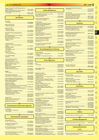 Log on to yellow.co.tz 55Tanzania Conference Services LtdDar es Salaam .......................................................... 0713 329923 ......................................................................... 0754 434101 ......................................................................... 0784 555033The One Hall The One Social Hall, Ground Flr, Bagamoyot Rd, Wazo .......0782 841151The Perfect Wedding Planners Block 6, Ground Flr, Togo St, Kinondoni .......................... 0655 279058Ubuntu Life Africa Dar es Salaam ............................ 0757 168303Vihaano Events Dar es Salaam ................................ 0715 207440ExportersAsas Dairies Ltd Jamhuri St, Dar es Salaam ............... 0222 865967East West Seed Tanzania Ltd Moshi .................... 0713 847456Evergreen Logistics (T) LTD11th Flr, Nnamdi Azikiwe Ave, Kivukoni ........................... 0746 075523 ......................................................................... 0787 661630FJS African Starch Development Cy Ltd Nelson Mandela Rd, Kinondoni ..................................... 0684 450802Fosea Green TanzaniaKinondoni Rd, Kinondoni ............................................. 0754 710970 ......................................................................... 0755 184076 ......................................................................... 0757 565676Grande Demam Dairy CompanyNjiro Rd, Arusha ........................................................ 0754 445891 ......................................................................... 0754 445919International Tanfeeds Ltd Morogoro ..................... 0716 210452Jofl o Co. LTD Kinondoni .......................................... 0784 820938Kuku Poa Ltd Nyerere Rd, Mwanza ........................... 0717 808212Kuku ProjectKinondoni ..................................................................0653 691138 ......................................................................... 0715 908307Mugeta Farms CO. LTD (Victoria Finest Products) Nyerere Rd, Mwanza ................................ 0677 034701Natural Extracts Industries Ltd Moshi .................. 0756 579333Nzua EnterprisesKinondoni Rd, Kinondoni ............................................. 0712 705839 ......................................................................... 0713 707165Red Onions Wholesale Pugu Rd, Upanga West ............................................... 0623 019558Tabora Bee HoneyTaifa Rd, Temeke ....................................................... 0718 907447 ......................................................................... 0766 907447 ......................................................................... 0782 907447Yumfarm EnterprisesKinondoni Rd, Kinondoni ............................................. 0685 179305 ......................................................................... 0714 375231Eye ClinicEyetech OpticalPlot No.760, Ground Flr, Mwananyamala ........................ 0621 818409 ......................................................................... 0674 034261Hakika Eye Care Plot 221, Ground Flr, Posta St, Kipawa ............................0672 811301Kinyerezi Eye Center Udzungwa Street, Tabata Bima St, Ilala .......................... 0626 708720FabricatorsAdvert Warehouse LimitedNairobi Rd, Arusha ..................................................... 0754 313364 ......................................................................... 0757 281941Birdi General Works LtdDar es Salaam .......................................................... 0654 274566Urambo St, Upanga West ............................................ 0784 302900EJ Aluminium Glazing FabricationBagamoyot Rd, Kijitonyama ......................................... 0714 208910 ......................................................................... 0755 770991 ......................................................................... 0784 440055Morgan Aluminium TanzaniaDar es Salaam .......................................................... 0715 006333Ilala ........................................................................ 0686 006333 ......................................................................... 0754 006333Obelix Investment Samora Ave, Dar es Salaam .......... 0653 074620255 System, CO Dar es Salaam .............................. 0774 555800FabricsMitumbaTrend-Tz Kinondoni Rd, Kinondoni ............... 0715 473669Facilities ManagementAnnEdmark Products Kinondoni Rd, Kinondoni ......... 0766 483376Family EntertainmentSee AlsoEntertainersFunSpot - Best Playland in Tanzania Julius K Nyerere Rd, Dar es Salaam .............................. 0786 443640Estate ManagementDoltu Architects Maktaba St, Dar es Salaam ............... 0654 003555Dream Glory ApartmentsZambia Rd, Kinondoni................................................. 0755 950050 ......................................................................... 0757 337337ELITE Property ManagementLivingstone St, Dar es Salaam ...................................... 0620 472352 ......................................................................... 0627 653273FG Apartment 856 Mikocheni, Mwai Kibaki Rd, Mikocheni ...................... 0754 566899LowMus Property Management Mwai Kibaki Rd, Mikocheni .......................................... 0716 998864Mawalla Consult Kinondoni Rd, Kinondoni ................. 0759 189381Palace Facilities Consult (T) Ltd Mwai Kibaki Rd, Mikocheni .......................................... 0765 944324Regus TanzaniaDar es Salaam .......................................................... 0222 196802Ohio St, Dar es Salaam ............................................... 0762 760197ServeCom Property ManagementMasasi St, Mchikichini ................................................. 0222 181334 ......................................................................... 0746 469507Solution Property Management Ltd Julius K Nyerere Rd, Dar es Salaam ............................